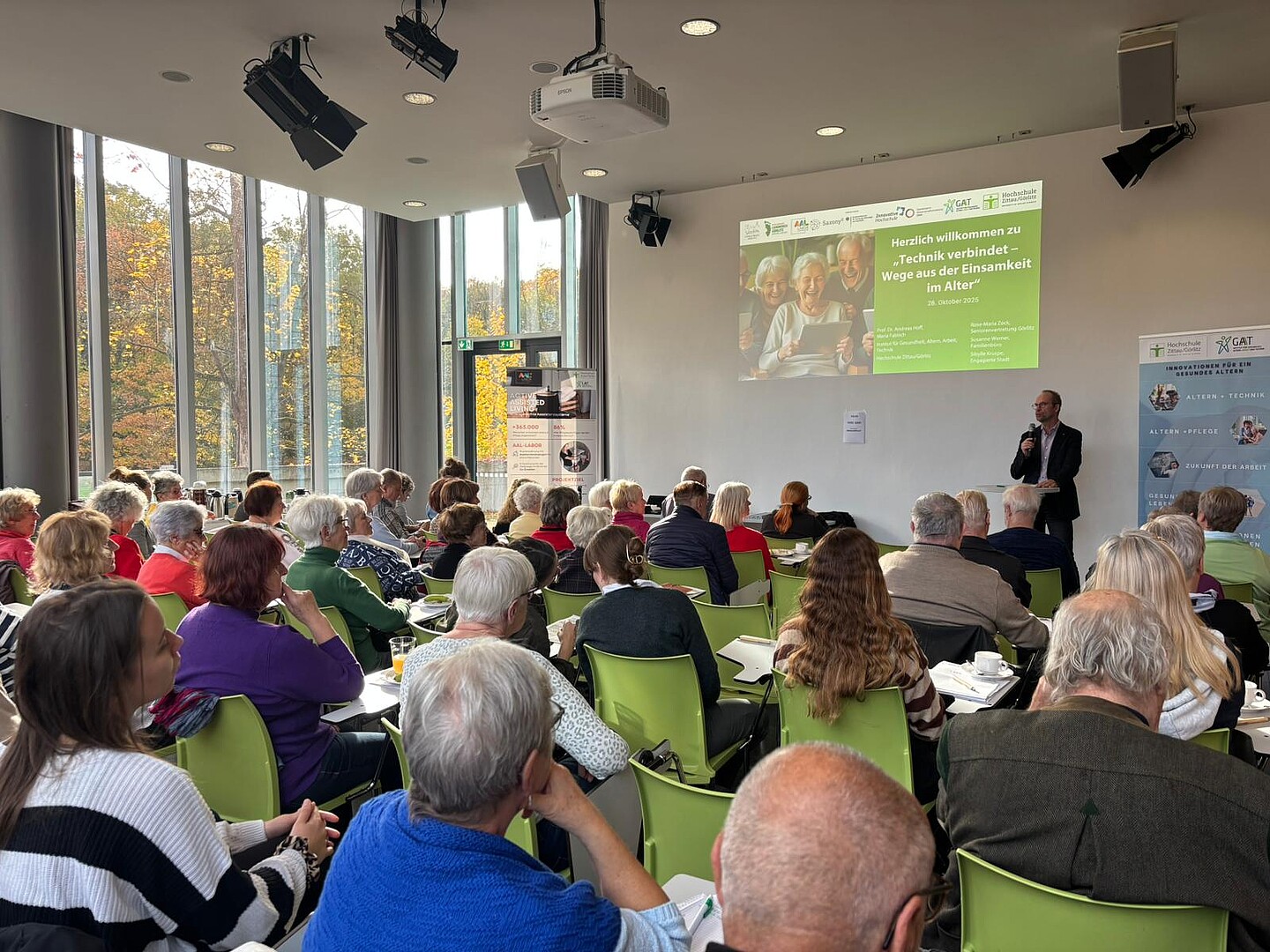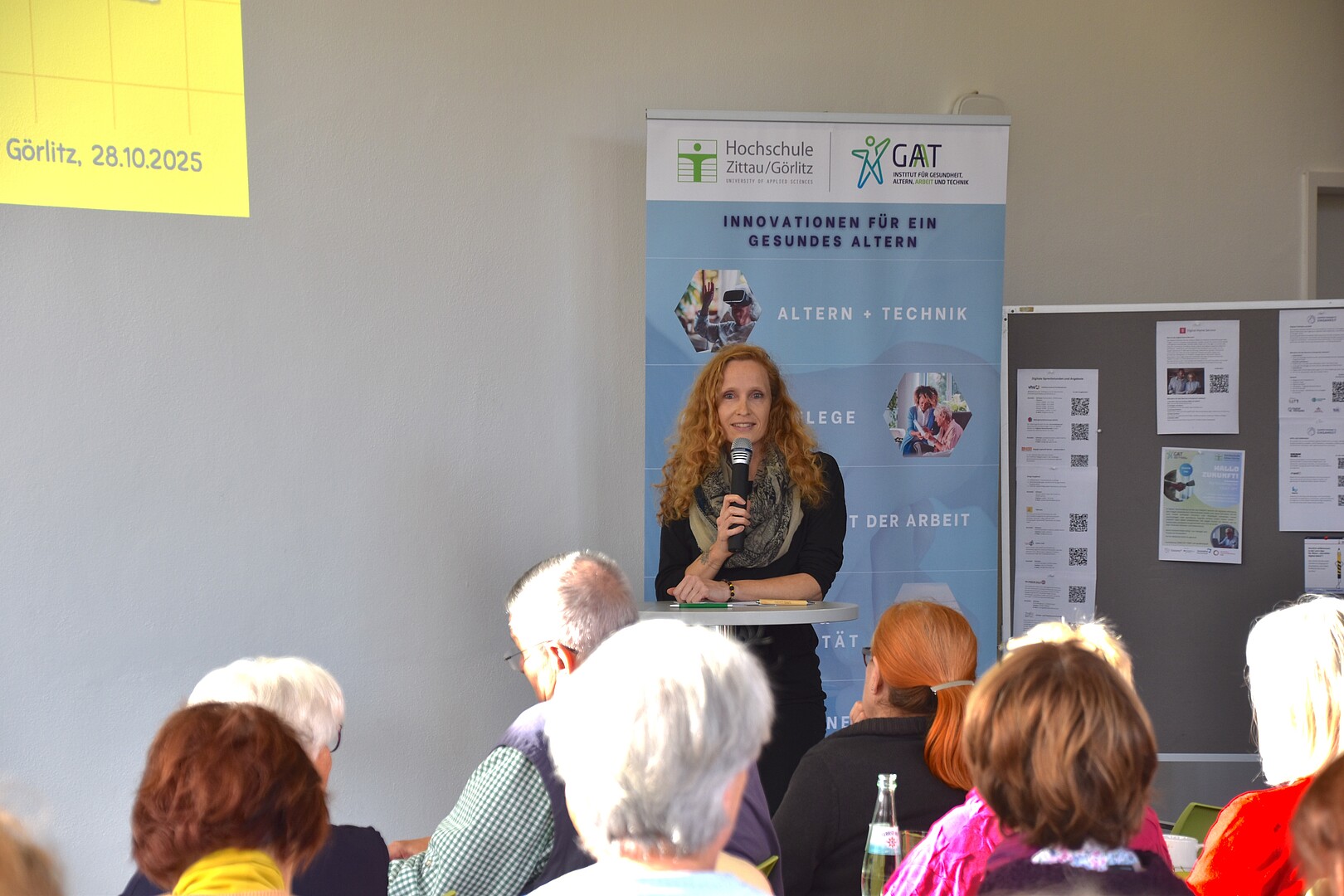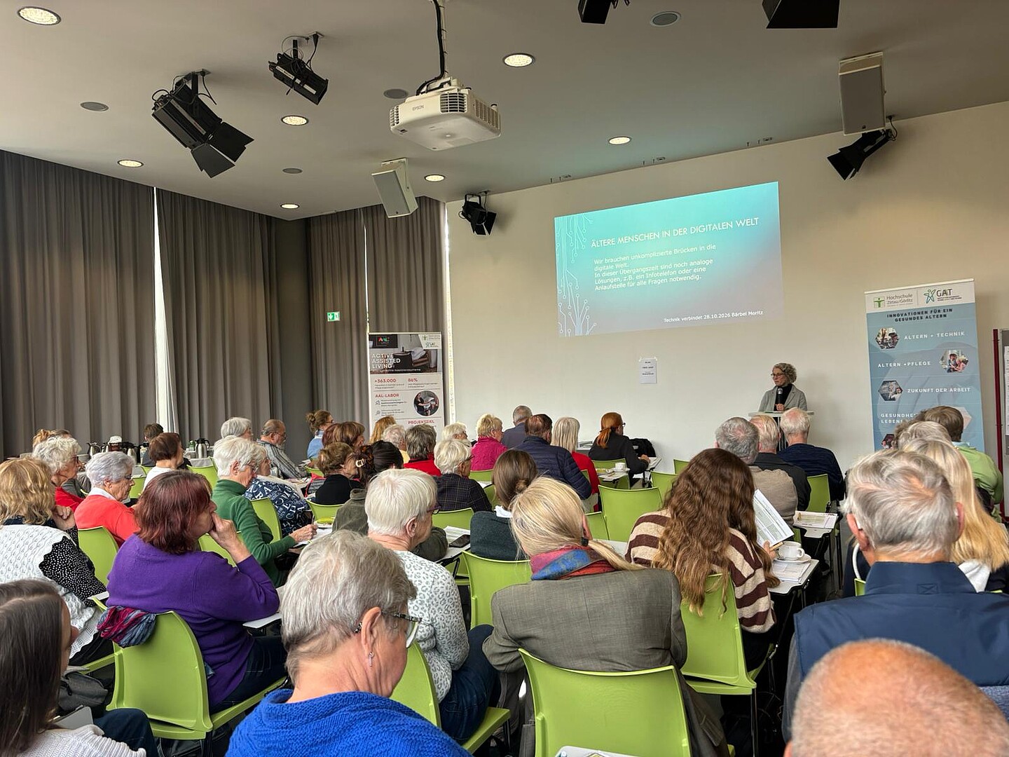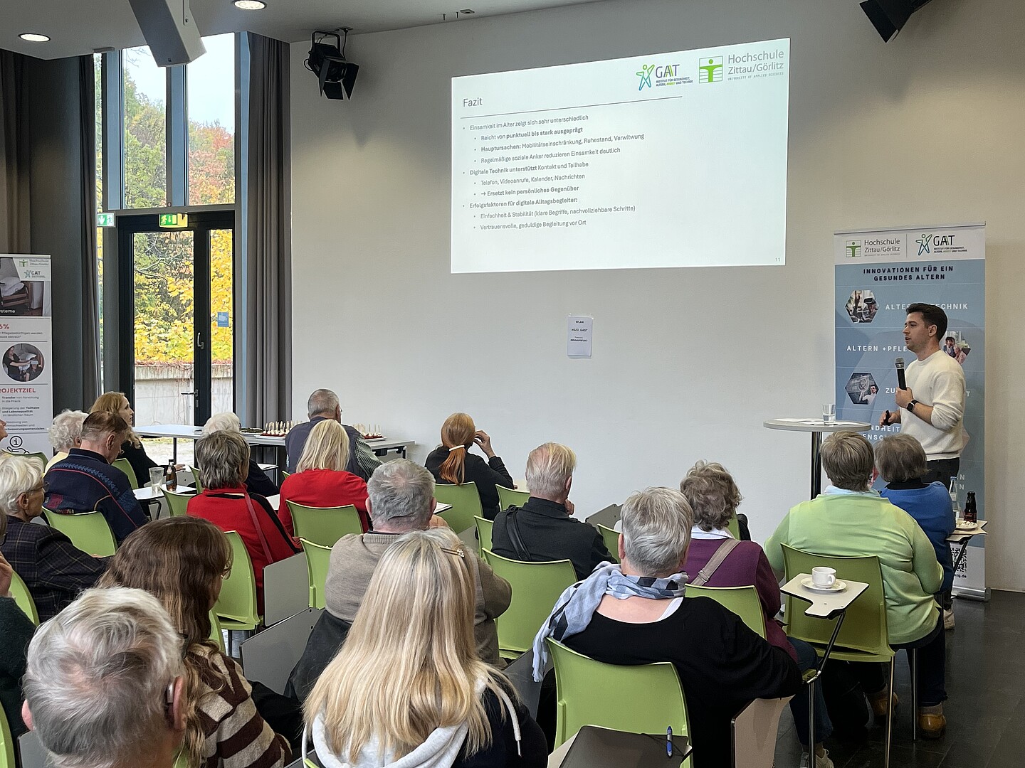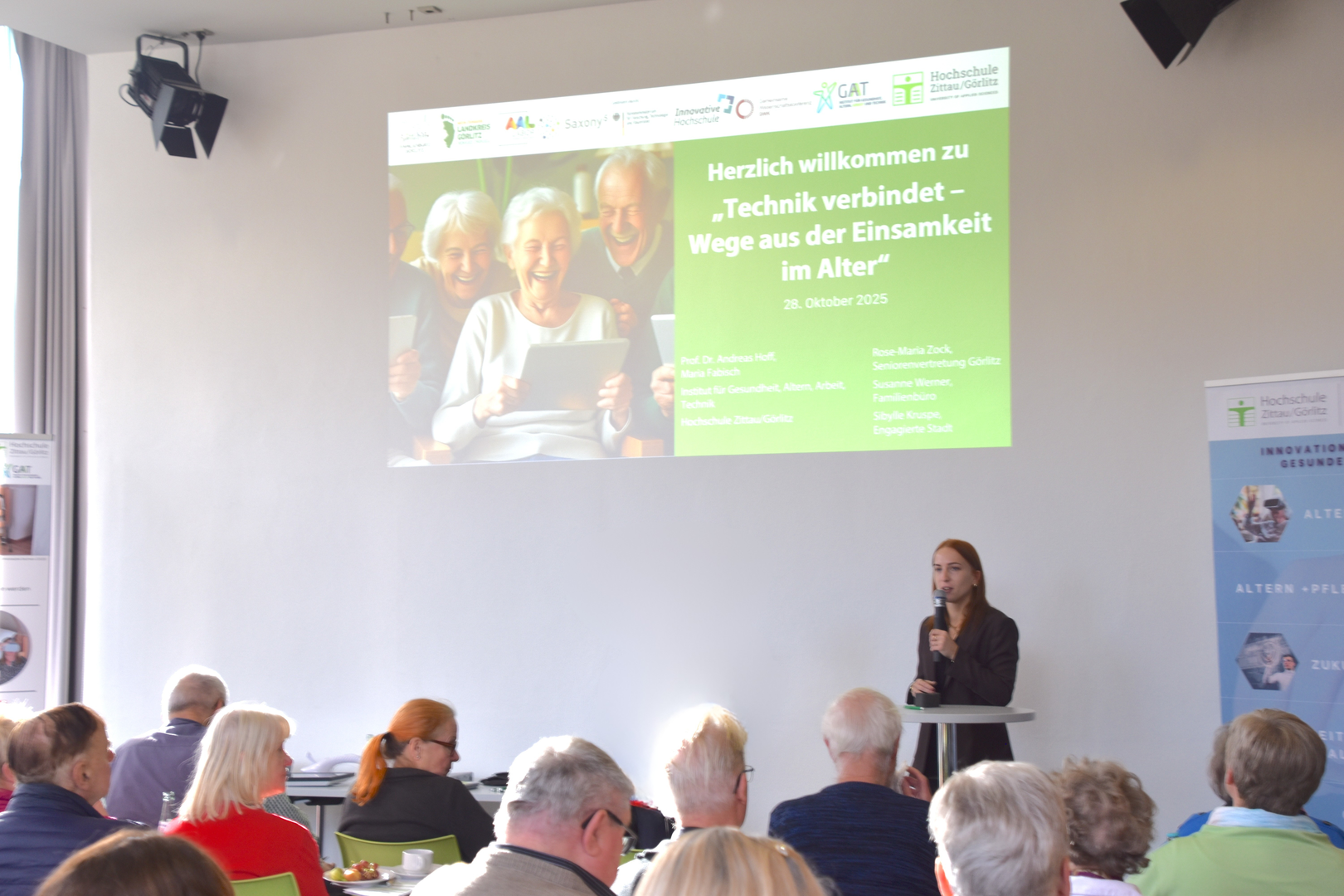 Am 28.10.2025 fand in der Hochschule Zittau/Görlitz eine Veranstaltung rund um digitale Teilhabe im Alter statt. Über 60 Seniorinnen und Senioren sowie Fachakteur:innen aus den Bereichen Technik- und Medienkompetenz, Pflege, Sozialarbeit, Wissenschaft und Zivilgesellschaft kamen zusammen, um sich über Chancen, Herausforderungen und praktische Ansätze im Umgang mit digitalen Technologien auszutauschen.