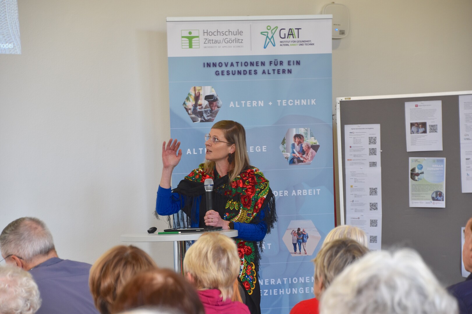 Nach der Begrüßung durch Maria Fabisch und Rose-Maria Zock von der Seniorenvertretung Görlitz, eröffnete Prof. Dr. Andreas Hoff, Direktor des GAT-Institutes mit einigen Worten zum Thema Einsamkeit den Vormittag. Er betonte, dass Einsamkeit nicht nur ein individuelles, sondern auch ein gesellschaftliches Thema sei – und dass Technik, richtig eingesetzt, helfen könne, soziale Teilhabe zu fördern und Brücken zwischen Generationen zu schlagen. Anschließend stellten Susanne Werner vom Familienbüro Görlitz und Sibylle Kruspe von der Engagierten Stadt Görlitz die Ergebnisse ihrer durchgeführten Umfrage vor, welche die Gründe für Einsamkeit von Senior:innen aufschlüsselte und gleichzeitig ein großes Interesse an den niedrigschwellige Angebote im Umgang mit Technik offenlegte.