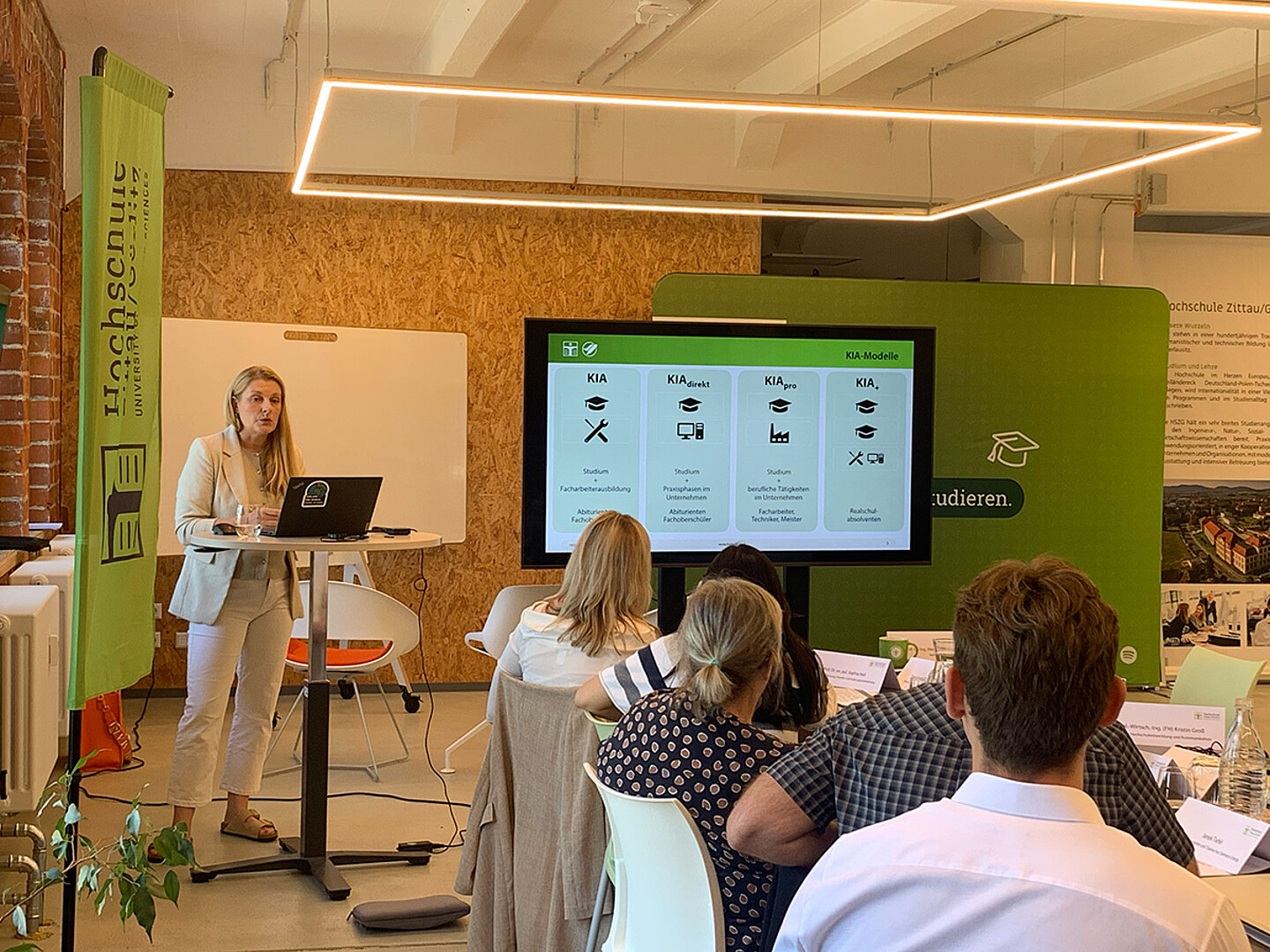 Zu den Gästen des Workshops zählte auch Siemens Energy – ein langjähriger und geschätzter KIA-Partner der HSZG. Janek Tiefel, Lernprozessbegleiter und Ausbildungsleiter von Siemens Energy, sowie der KIA-Studierende Martin Alexander Schlemmer gewährten wertvolle Einblicke in die gelebte Praxis der dualen Ausbildung. Sie berichteten über erfolgreiche Kooperationsmodelle und zeigten auf, wie die Integration von KIA-Studierenden im Unternehmensalltag gelingen kann. Besonders eindrucksvoll schilderte Martin Alexander Schlemmer seine persönlichen Studien- und Praxiserfahrungen und machte deutlich, warum er sich immer wieder für das KIA-Studium an der HSZG entscheiden würde. Die Beiträge von Siemens Energy dienten als praxisnaher Impulsgeber für die anschließende Diskussion mit Infineon.
