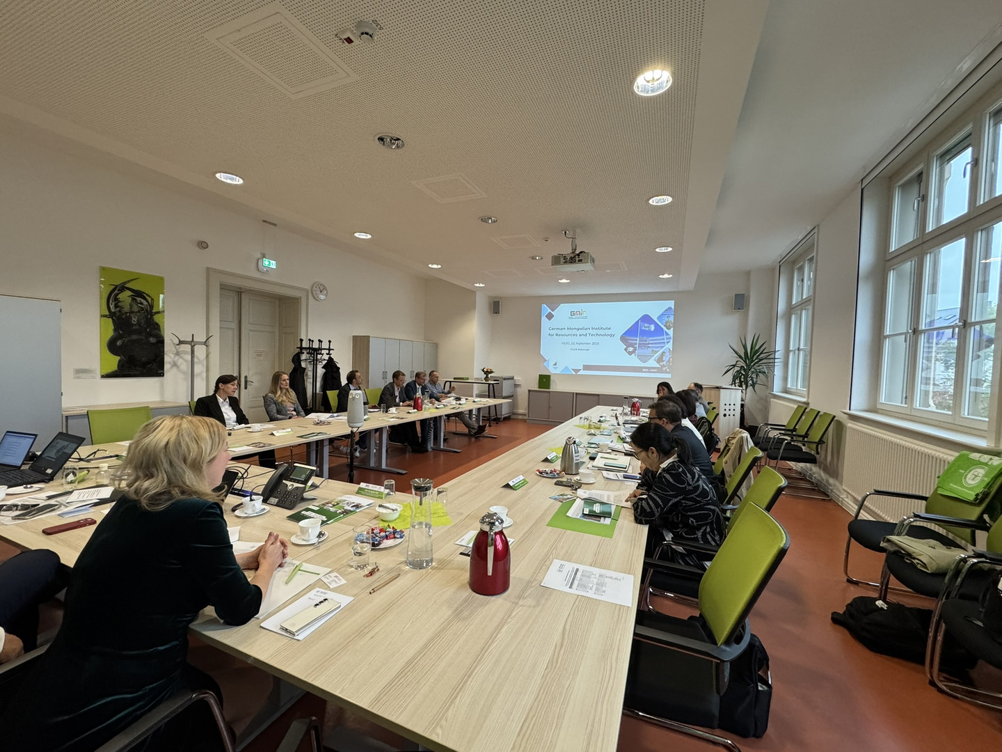 Vonseiten der Gäste stellten neben Rektorin Prof. Dr. Baatar die beiden Dekane, Prof. Dr. Gantuya Ganbat (Fakultät für Rohstoff- und Umwelttechnik) und Prof. Dr. Sungchil Lee (Fakultät für Maschinenbau und Elektrotechnik), ihre Fachbereiche vor. Sebastian Burghof, Projektmanager bei der GIZ, erläuterte den aktuellen Projektstand und die weiteren Möglichkeiten.