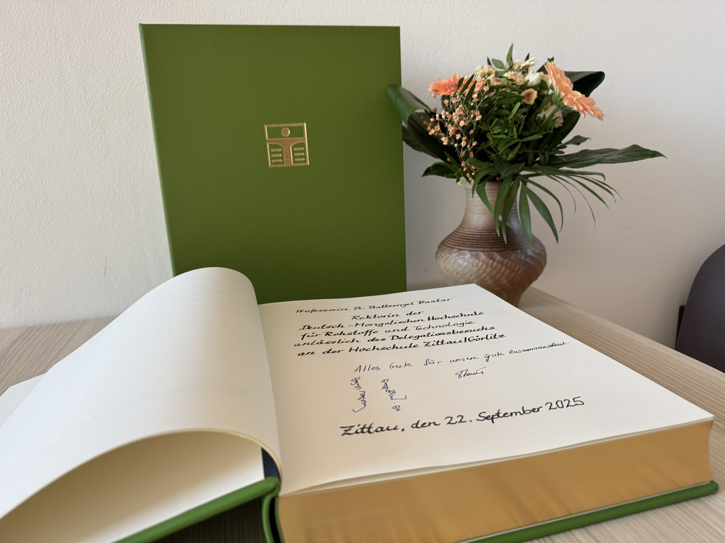 Im Anschluss empfing das Rektorat, vertreten durch den Rektor, Prof. Dr. Alexander Kratzsch, und die Prorektorin für Forschung, Transfer und Internationalisierung, Prof. Dr. Sophia Keil, die Gäste im Senatssaal. Ein besonderer Höhepunkt folgte gleich zu Beginn: der Eintrag der GMIT-Rektorin, Prof. Dr. Battsengel Baatar, in das Goldene Buch der HSZG. Sie hinterließ ihre besten Wünsche für die weitere Zusammenarbeit, auch in klassischer altmongolischer Schrift.