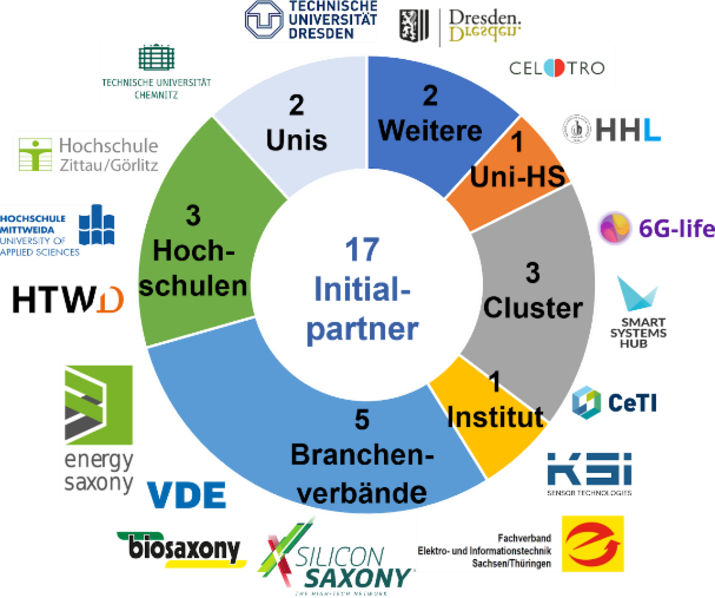 Der Verbund startete mit 17 Initialpartnern – verteilt über die Innovationszentren Leipzig, Chemnitz, Dresden, Zittau, Mittweida und Waldheim. Die Partnerkategorien umfassen 2 Universitäten, 3 Hochschulen, 1 private Universität, 1 Institut, 3 (Exzellenz-/Innovations-)Cluster, 5 Branchenverbände sowie 2 weitere Partner.