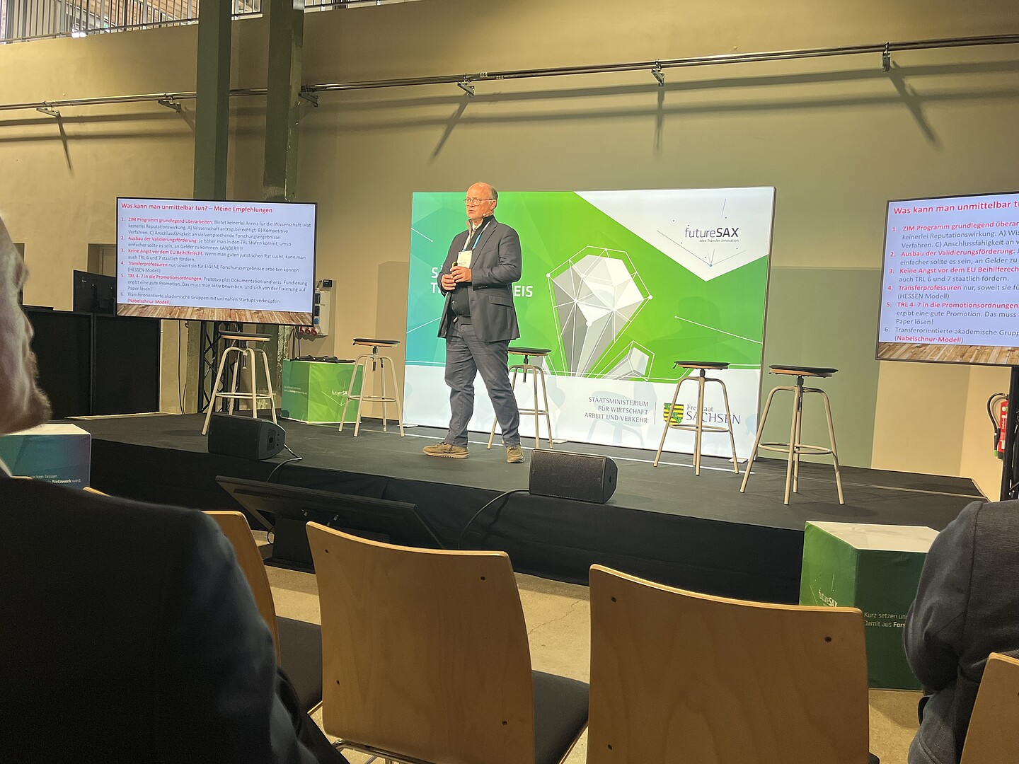 Besonders in Erinnerung blieb der Impulsvortrag von Prof. Dr. Hans-Henning von Grünberg, Professur für Wissens- und Technologietransfer an der Universität Potsdam. Er verdeutlichte, warum Deutschland trotz seiner Rolle als starke Wissenschaftsnation im Transfer von Forschungsergebnissen in marktfähige Anwendungen noch ungenutztes Potenzial aufweist – insbesondere im sogenannten „Valley of Death“ auf den TRL-Stufen 4 bis 6, also genau in der Phase, in der aus wissenschaftlichen Erkenntnissen funktionsfähige Prototypen und Pilotanwendungen entstehen müssen.
