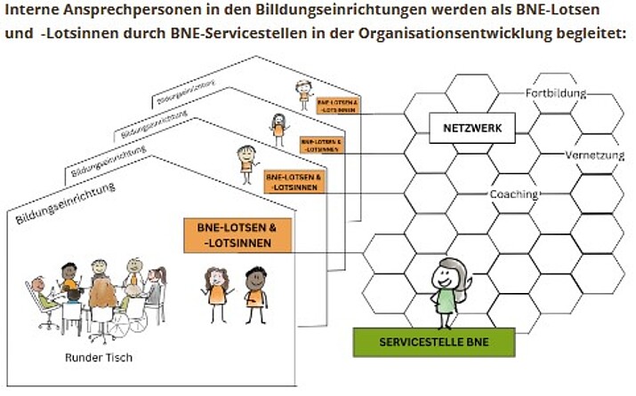 Das BNE-Lotsenprogramm ist ein zentraler Baustein zur Umsetzung der Sächsischen Landesstrategie BNE (2019) an Schulen im ländlichen Raum Sachsens. Im Mittelpunkt stehen engagierte Lehrkräfte – die sogenannten BNE-Lotsen –, die Schulen dabei unterstützen, Bildung für nachhaltige Entwicklung im Sinne eines Whole Institution Approach zu verankern. Über Formate wie den „Runden Tisch“ bringen sie Mitglieder der Schulgemeinschaft zusammen, stoßen Austausch und Reflexion an und stärken die regionale Vernetzung. Ergänzt wird dies durch regelmäßige Fort- und Weiterbildungsangebote sowie die fachliche Begleitung durch die regionalen Servicestellen BNE.