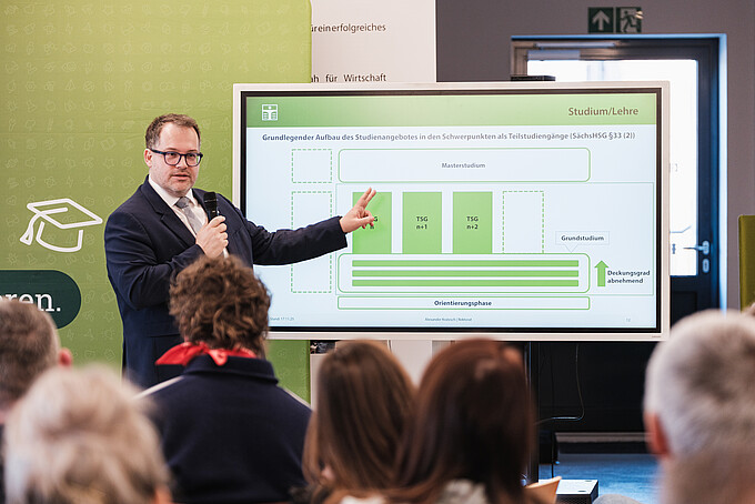 Im Mittelpunkt der Veranstaltung stand die strukturelle Neuausrichtung der Hochschule Zittau/Görlitz, die Rektor Prof. Dr.-Ing. Alexander Kratzsch in einem Impulsvortrag einordnete. Dabei wurde deutlich, dass das ausbildungsintegrierte Studienmodell KIA auch künftig ein zentraler Bestandteil der Hochschulentwicklung bleibt und weiter gestärkt wird.